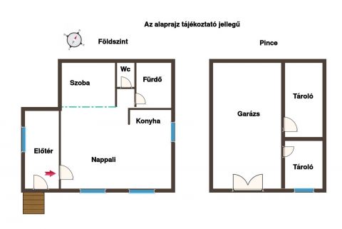 Földszinti elosztás: Tágas előtér, nappali, konyha, egy külön hálószoba, valamint fürdőszoba és WC.