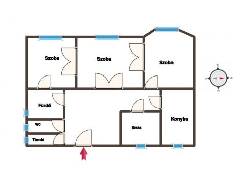 Its 3 large rooms face Visegrádi Street, while the 4th room faces the courtyard. The layout includes a separate kitchen, a large bathroom, a separate toilet, and a storage room.