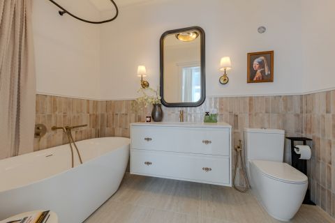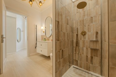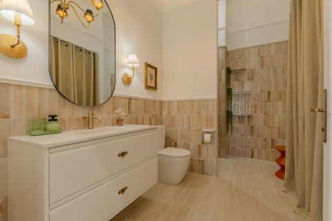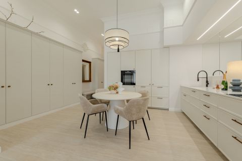 The apartment features 4-meter ceiling height, spacious and bright interiors. The well-designed layout includes a living room + 2 bedrooms, as well as 2 bathrooms. In addition to the custom-designed dining kitchen, built-in bespoke storage solutions and walk-in wardrobe areas provide maximum comfort and practicality. Heating is provided by an individual gas boiler system.